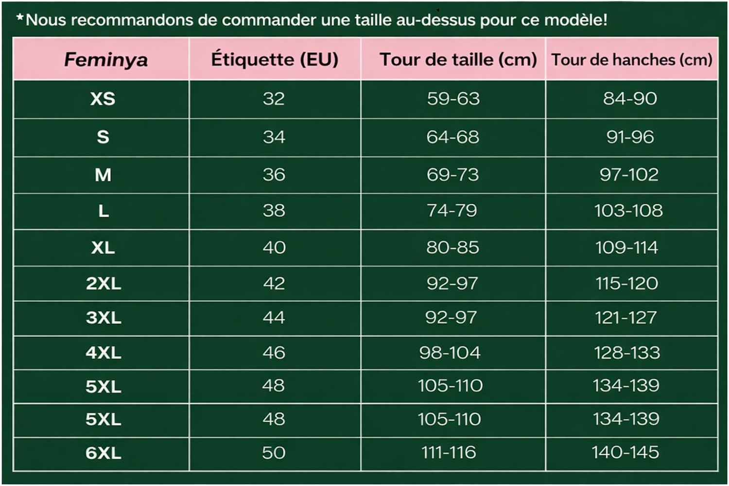 Pour choisir la bonne taille, consultez notre guide des tailles ci-dessus. En général, vous pouvez choisir votre taille habituelle. La plupart des femmes trouvent que nos sous-vêtements taillent normalement. Les sous-vêtements qui taillent petit sont indiqués sur la page du produit.^^